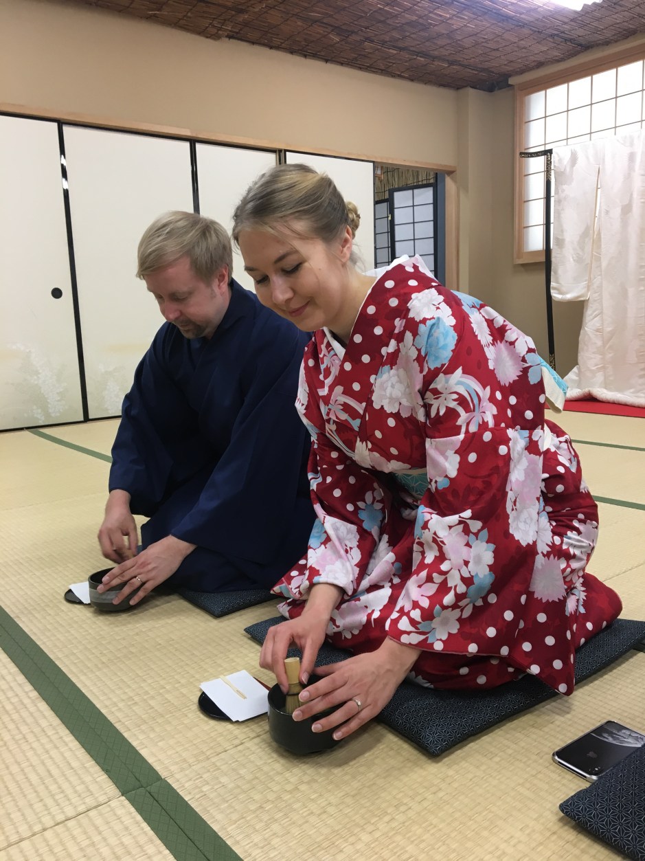 Another great, more touristy (but, that’s what we were…) experience was Kimono Tea Ceremony Maikoya. A real tea ceremony would take hours, now we got to experience how it is to be dressed the Japanese way (time-consuming) and the making of matcha (fun, but specific) in a condensed mode.